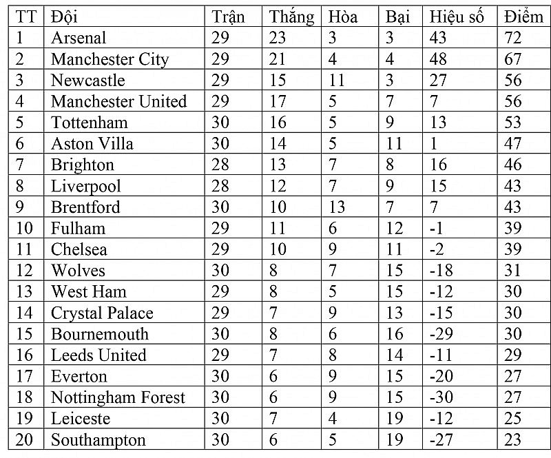 Bảng xếp hạng ngoại hạng Anh hôm nay: