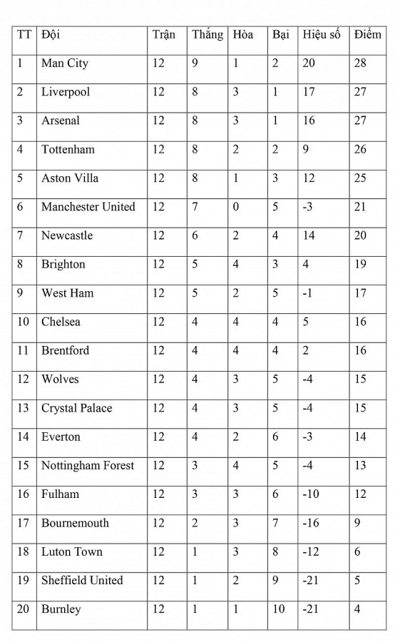 Bảng xếp hạng ngoại hạng Anh hôm nay: