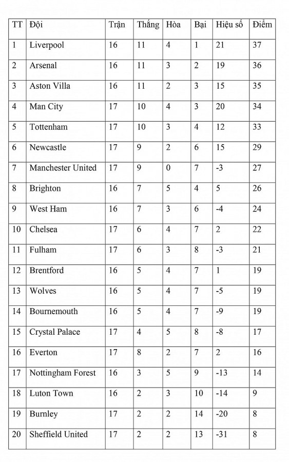 Ở các trận đấu đáng chú ý khác ở vòng 17 Ngoại hạng Anh rạng sáng và đêm ngày 16/12: Nottingham thua Tottenham 0-2, Newcastle thắng Fulham 3-0, Bournemouth hòa Luton Town 1-1.