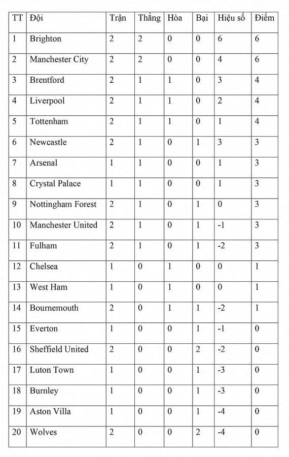 Ở trận cầu tâm điểm vòng 2 Ngoại hạng Anh rạng sáng 20/8/2023, Man City giành chiến thắng 1-0 trước đội khách Newcastle. Với kết quả này, Man City có cùng 6 điểm với Brighton, nhưng xếp vị trí thứ 2 do thua hiệu số bàn thắng bại.
