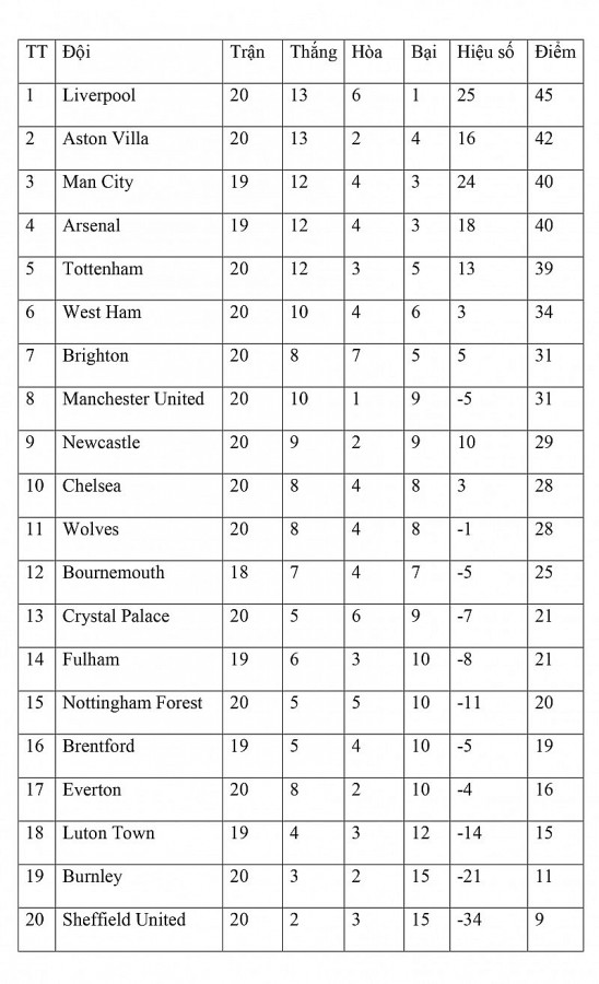 Bảng xếp hạng ngoại hạng Anh hôm nay:
