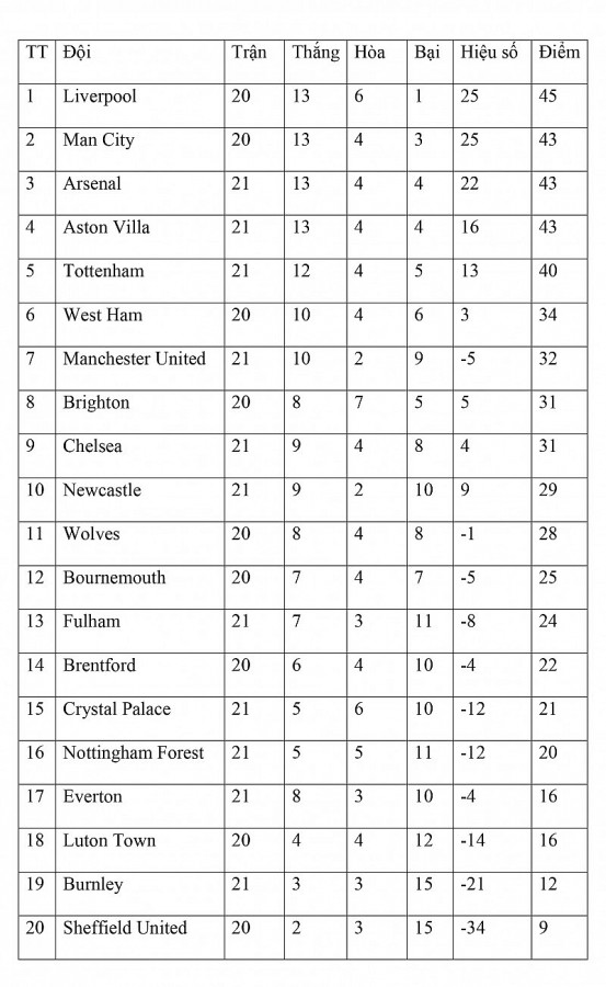 Bảng xếp hạng ngoại hạng Anh hôm nay: