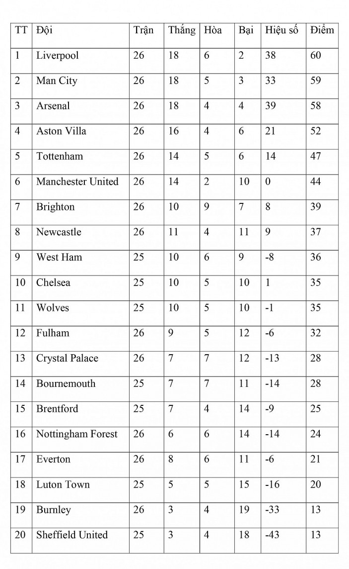 Bảng xếp hạng ngoại hạng Anh hôm nay: