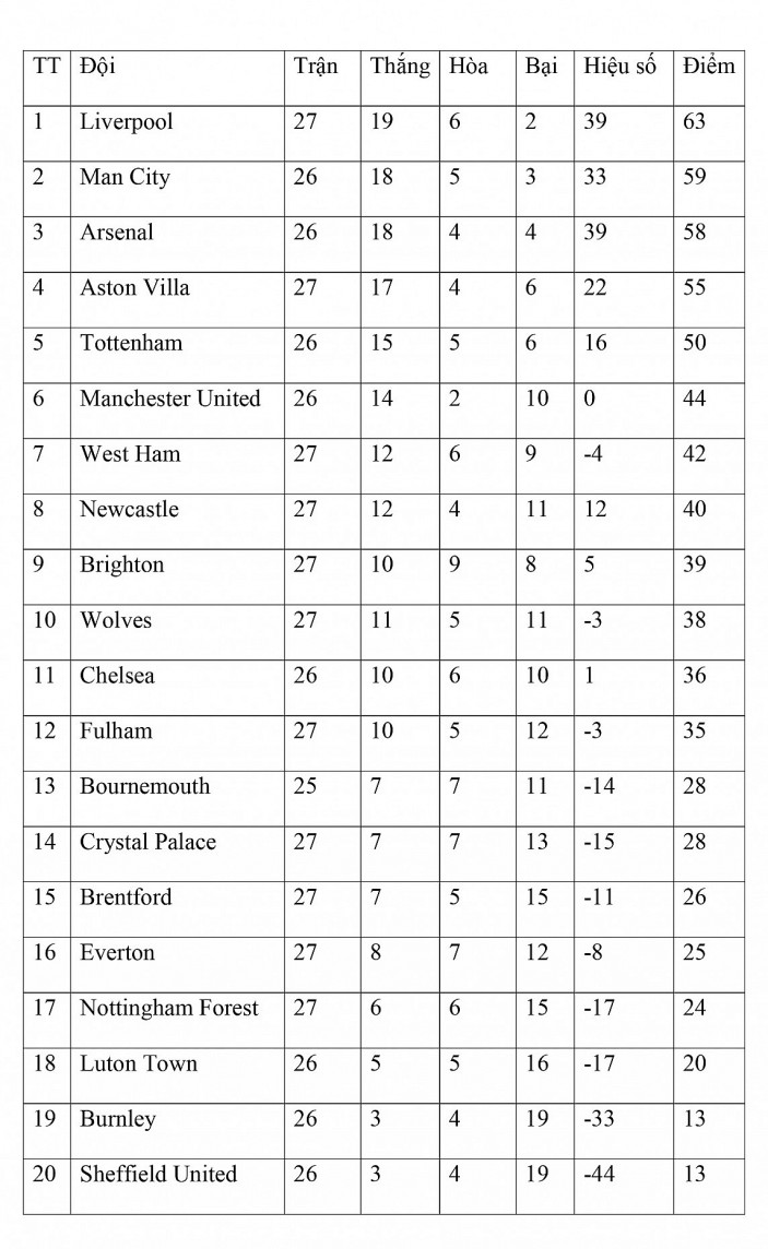 Bảng xếp hạng ngoại hạng Anh hôm nay: