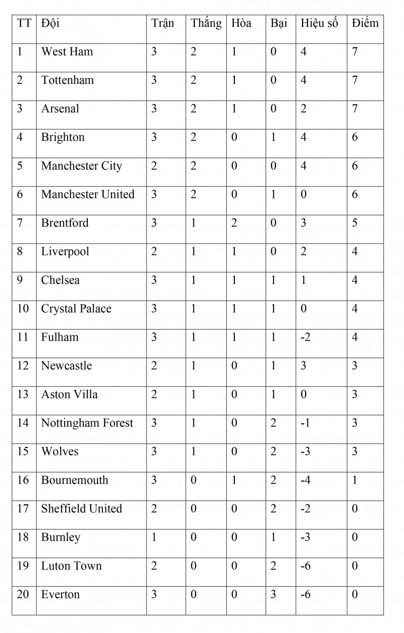 Ở trận đấu muộn nhất vòng 3 Ngoại hạng Anh rạng sáng 27/8/2023, West Ham giành chiến thắng thuyết phục 3-1 trước đội chủ nhà Brighton. Với kết quả này, West Ham vươn lên chiếm ngôi đầu bảng khi có cùng 7 điểm với Tottenham và Arsenal do hơn chỉ số phụ. Trong khi đó, với việc thất bại trên sân nhà, Brighton để West Ham chiếm mất ngôi đầu, đồng thời tụt xuống vị trí thứ 4 trên bảng xếp hạng với 6 điểm sau 3 vòng đấu.