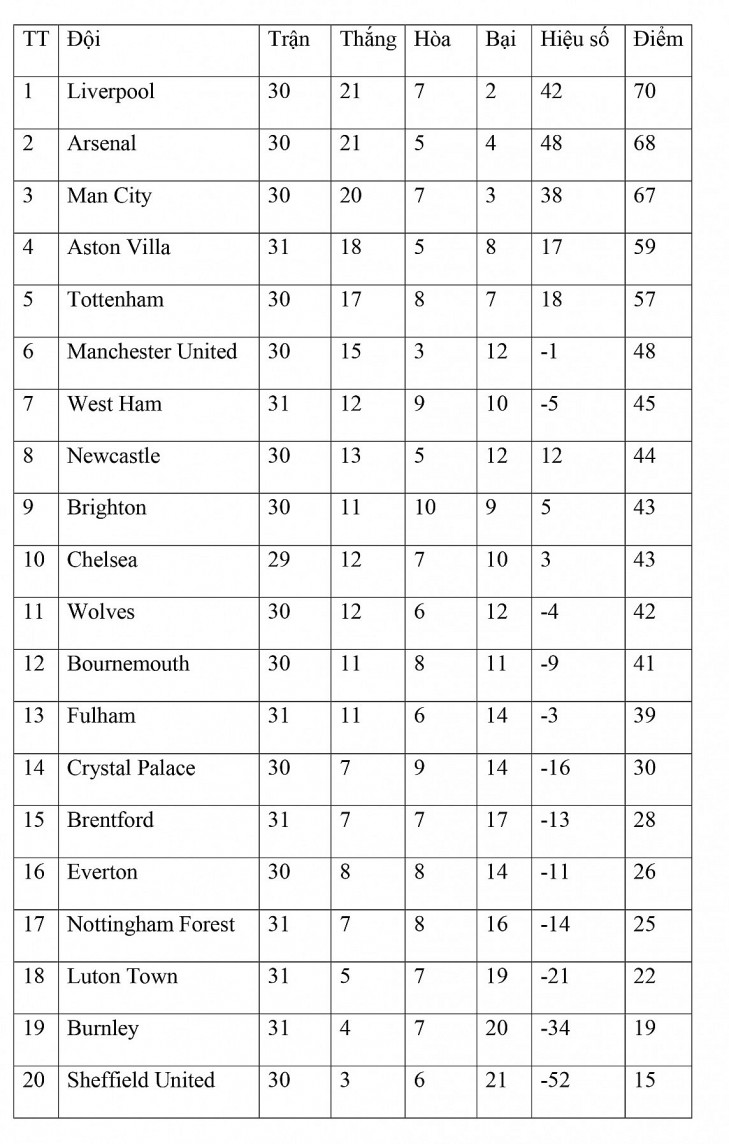 Bảng xếp hạng ngoại hạng Anh hôm nay: