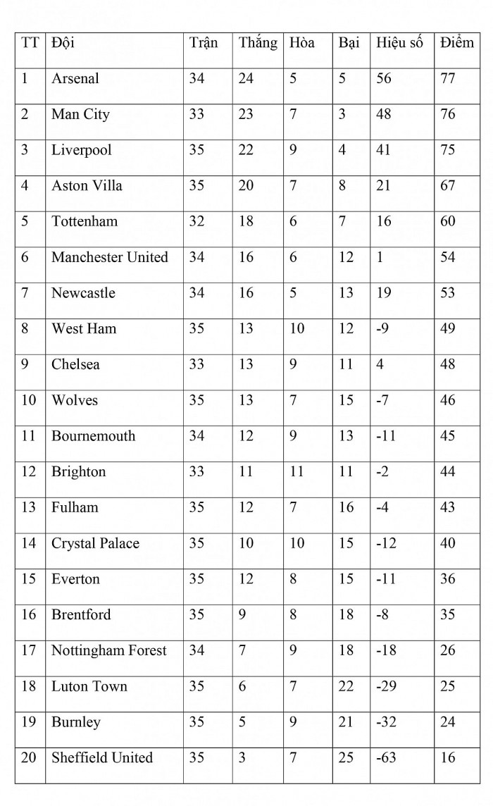 Bảng xếp hạng ngoại hạng Anh hôm nay: