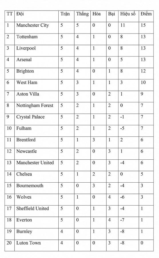 Bảng xếp hạng vòng 5 Ngoại hạng Anh ngày 17/9: MU thua bạc nhược, Tottenham-Liverpool áp sát đội đầu bảng Man CityBảng xếp hạng vòng 5 Ngoại hạng Anh ngày 18/9: Arsenal trở lại Top 4, Chelsea gây thất vọng