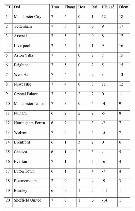 Ở các trận đấu đáng chú ý khác ở vòng 7 tối ngày 30/9: Man United thua Crystal Palace 0-1, Newcastle thắng Burnley 2-0, West Ham thắng Sheffield 2-0, Everton thua Luton Town 1-2.