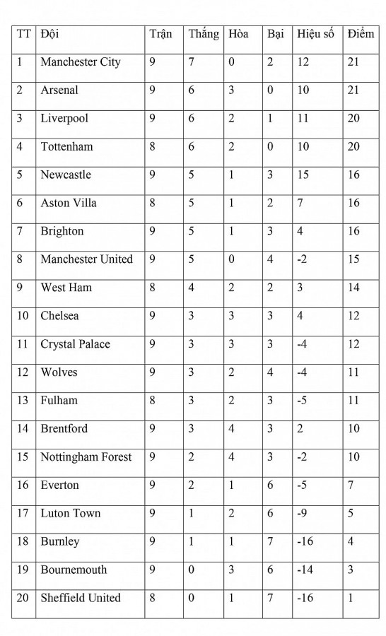 Bảng xếp hạng Giải bóng đá Ngoại hạng Anh 2023-2024. Cập nhật liên tục bảng xếp hạng bóng đá Ngoại hạng Anh mùa giải 2023-2024 mới và chính xác nhất.