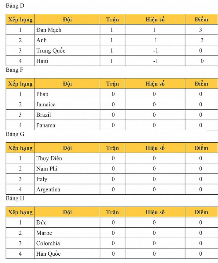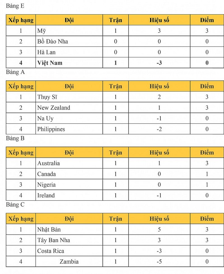 Bảng xếp hạng vòng bảng World Cup nữ 2023 hôm nay: