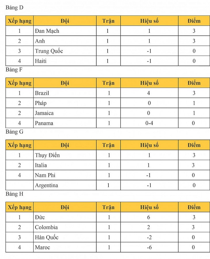 Bảng xếp hạng vòng bảng World Cup nữ 2023 hôm nay: