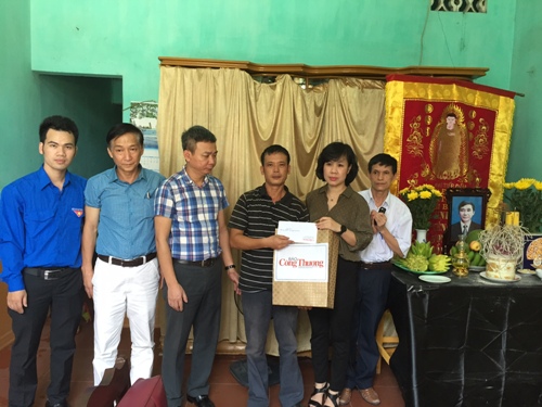 Ông Trần Quang Cảnh (trái) - Chủ tịch Công đoàn Công ty Than Mông Dương - thay mặt gia đình anh Đỗ Văn Nhiên đón nhận tình cảm của báo Công Thương