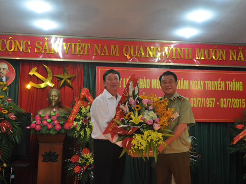 Giám đốc Sở Công Thương Hà Nội Lê Hồng Thăng (bên trái) trao tặng hoa cho Chi cục trưởng Chi cục QLTT Hà Nội Chu Xuân Kiên nhân 58 năm Ngày truyền thống lực lượng QLTT