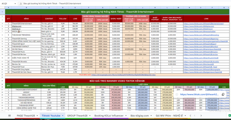 | Bảng giá quảng cáo trên hệ thống kênh Tiktok thuộc Theanh28 Entertainment. |