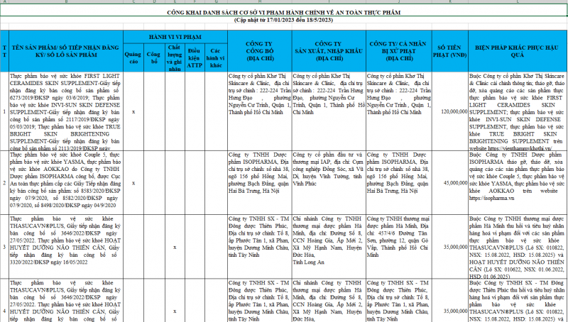 | Danh sách cơ sở vi phạm an toàn thực phẩm từ 17/1/2023 đến 18/5/2023. |