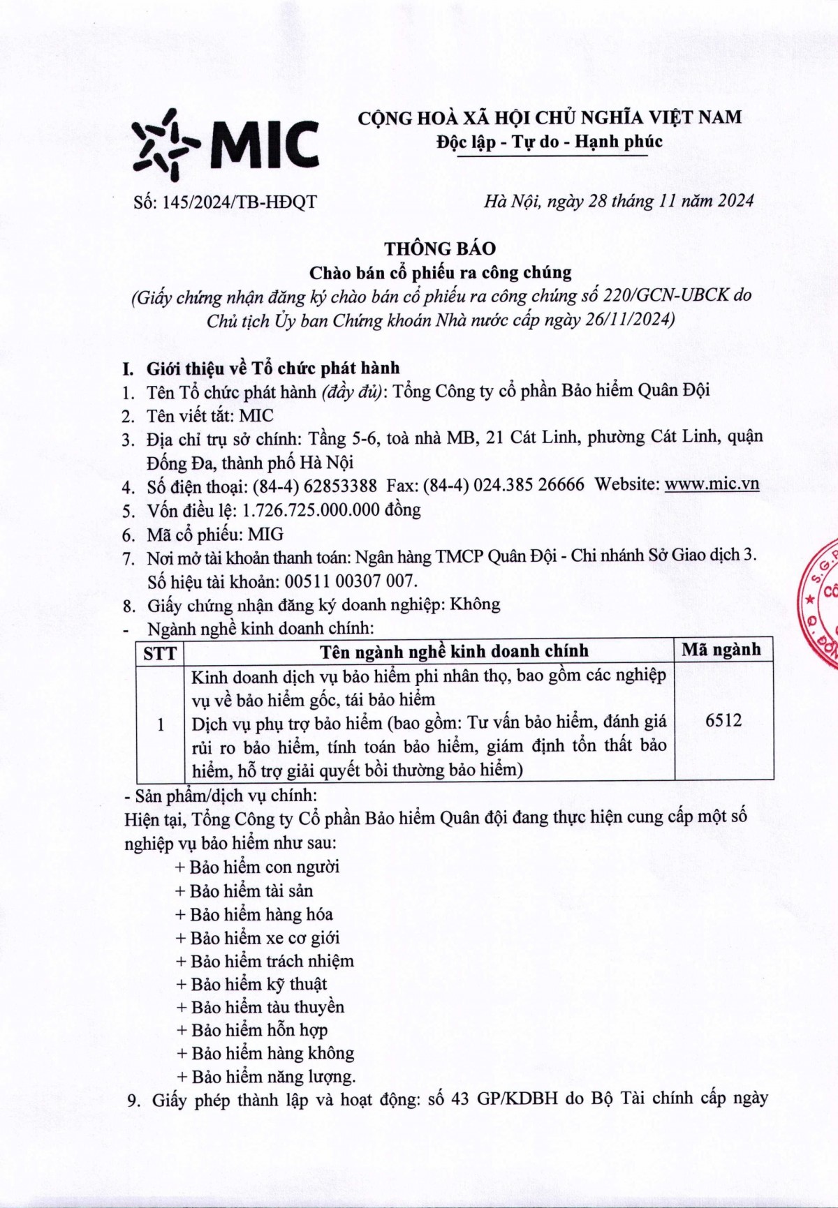 Bảo hiểm Quân đội (MIC) thông báo chào bán cổ phiếu ra công chúng