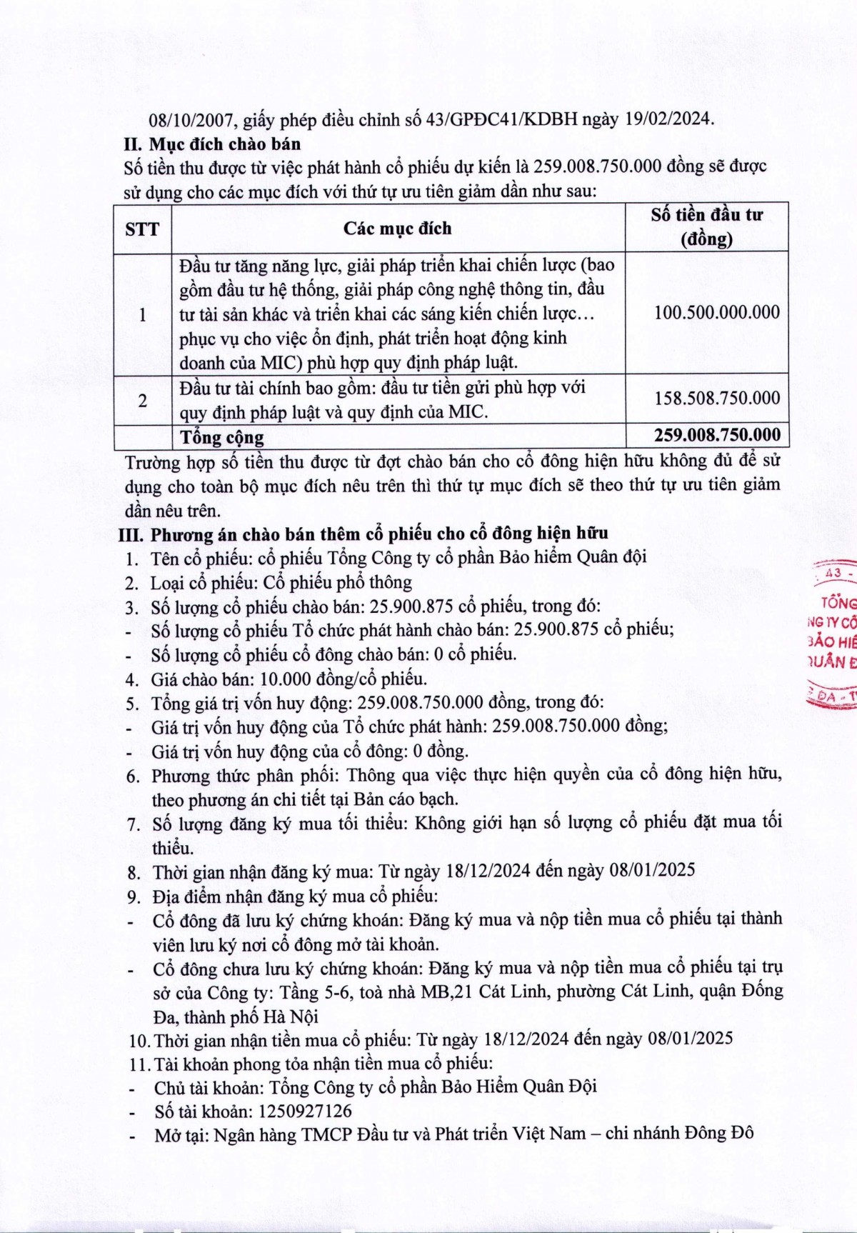 Bảo hiểm Quân đội (MIC) vừa chính thức đăng ký chào bán thêm hơn 25,9 triệu cổ phiếu ra công chúng, mở ra cơ hội đầu tư hấp dẫn cho các nhà đầu tư.
