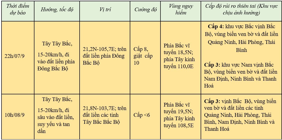 Theo Trung tâm Dự báo khí tượng thủy văn quốc gia: Hồi lúc 11 giờ ngày 7/9, vị trí tâm bão: Khoảng 20.6 độ Vĩ Bắc; 107.5 độ Kinh Đông, trên vùng biển Quảng Ninh – Hải Phòng. Sức gió mạnh nhất: Cấp 13 (134-149km/h), giật cấp 16. Dự báo: Trong 3 giờ tới, bão di chuyển theo hướng Tây Tây Bắc, tốc độ khoảng 15-20km/h.