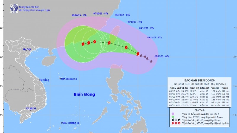 Đến 7h ngày 5/10, bão di chuyển theo hướng Tây Tây Bắc, tốc độ khoảng 10km/h, vị trí 22,4N-120,1E; Cường độ cấp 13, giật cấp 16; Vùng nguy hiểm từ phía Bắc vĩ tuyến 19,0N; phía Đông kinh tuyến 118,0E. Cấp độ rủi ro thiên tai; Khu vực chịu ảnh hưởng phía Đông Bắc khu vực Bắc Biển Đông.