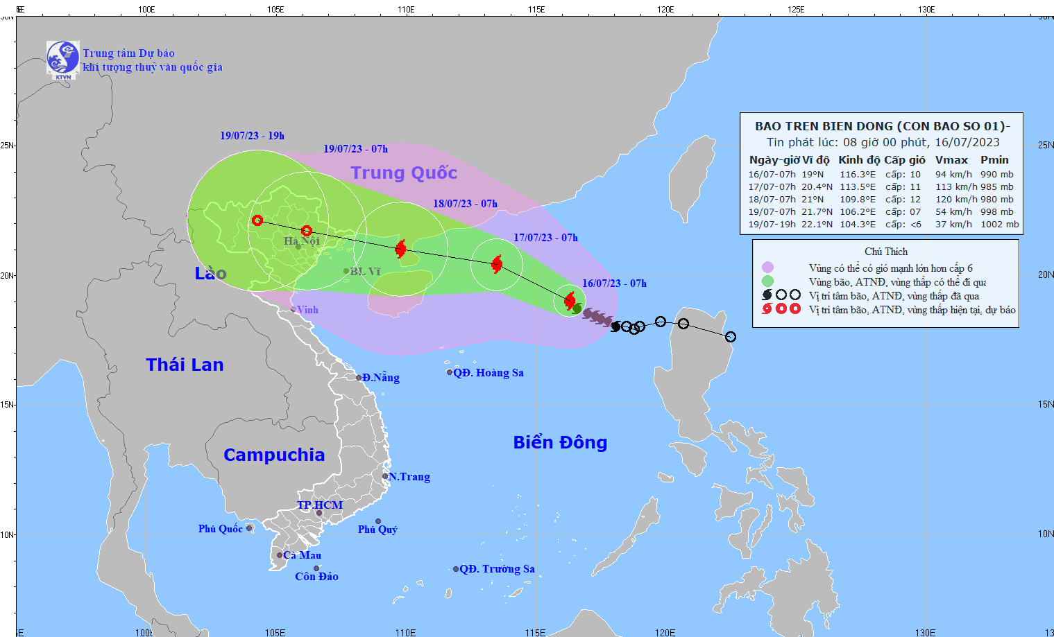 Sáng nay 16/7, vị trí tâm bão ở vào khoảng 19 độ vĩ Bắc, 116,3 độ kinh đông cách bán đảo Lôi Châu 670 km về phía Đông Đông Nam, cường độ bão mạnh cấp 10, dự báo trong 24- 48 giờ tới bão số 1 tiếp tục di chuyển theo hướng Tây Tây Bắc với tốc độ trung bình khoảng 15km/h.