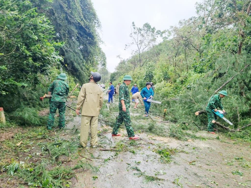 | Cán bộ, chiến sĩ Đồn Biên phòng cửa khẩu cảng Vạn Gia, Bộ đội Biên phòng Quảng Ninh giúp người dân dọn dẹp cây xanh đổ gãy trên đường. Ảnh: BPQN |