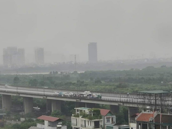 Vào khoảng 13h50, chiều 7/9, nhiều người đi xe máy bị gió bão kèm theo cơn mưa nặng hạt “giữ chân” trên cầu Nhật Tân không thể di chuyển được do ảnh hưởng của cơn bão số 3, khi bắt đầu đổ bộ vào Hà Nội.