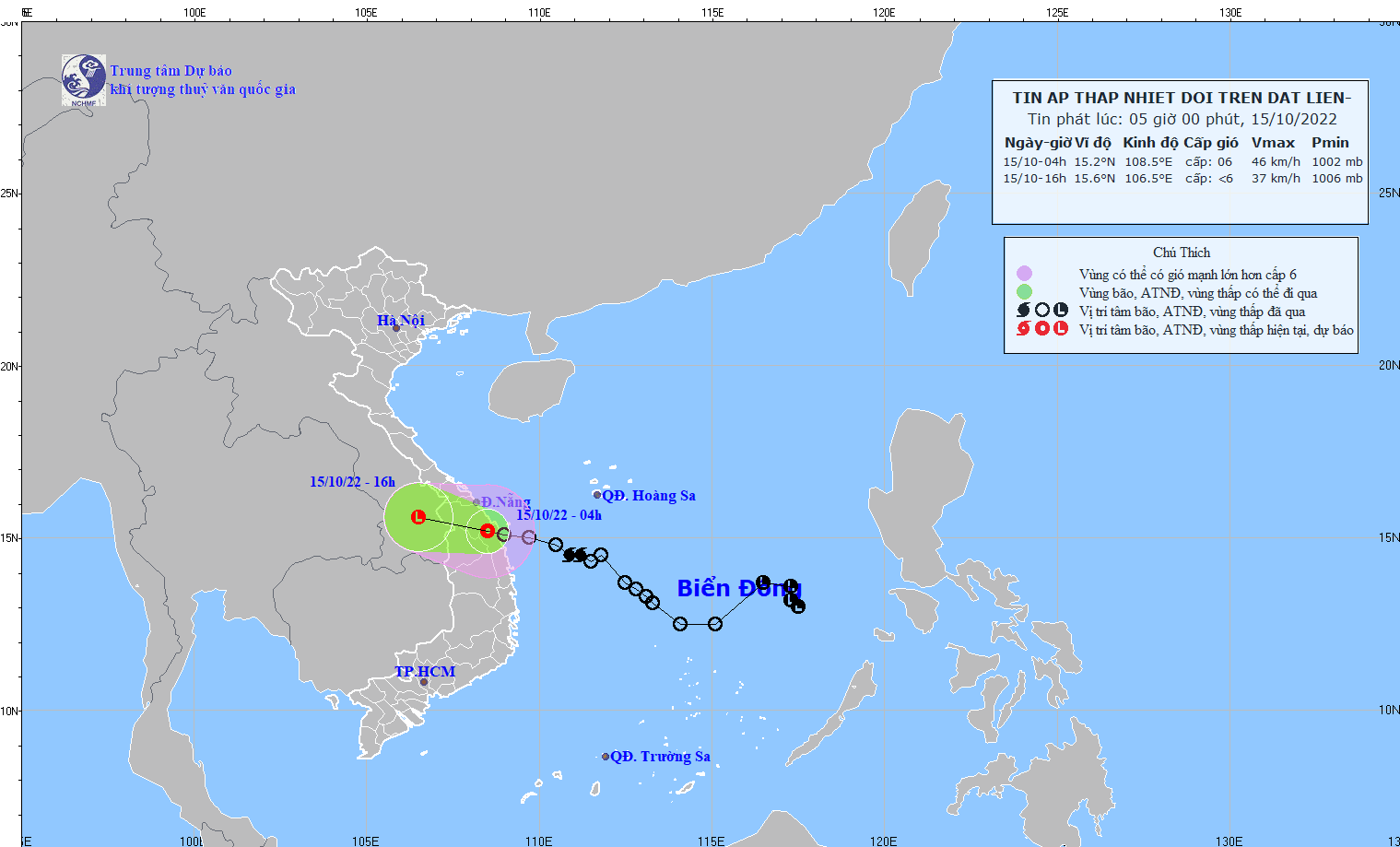 Hồi 04 giờ, vị trí tâm áp thấp nhiệt đới ở vào khoảng 15,2 độ Vĩ Bắc; 108,5 độ Kinh Đông trên đất liền khu vực Quảng Nam-Quảng Ngãi. Sức gió mạnh nhất vùng gần tâm áp thấp nhiệt đới mạnh cấp 6 (39-49km/giờ), giật cấp 8, di chuyển theo hướng Tây Tây Bắc với tốc độ 15-20km/h.