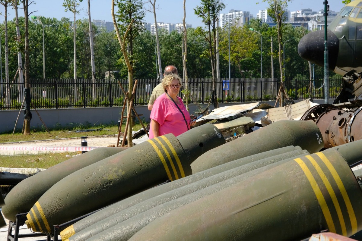 | Hai du khách nước ngoài tham quan khu vực trưng bày một số loại bom từng được phía Mỹ thả ở chiến tranh Việt Nam. |