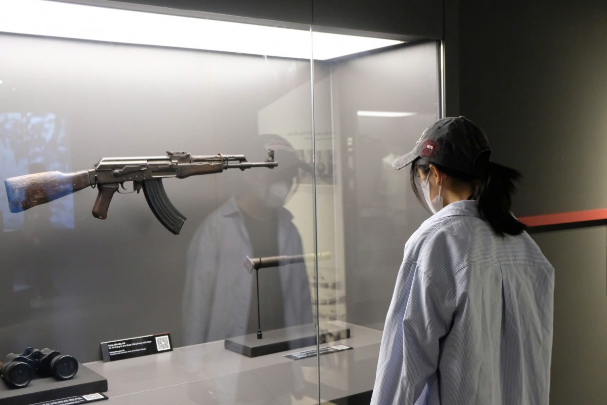 | Một nữ du khách trẻ ngắm nhìn hiện vật là khẩu súng trường. |