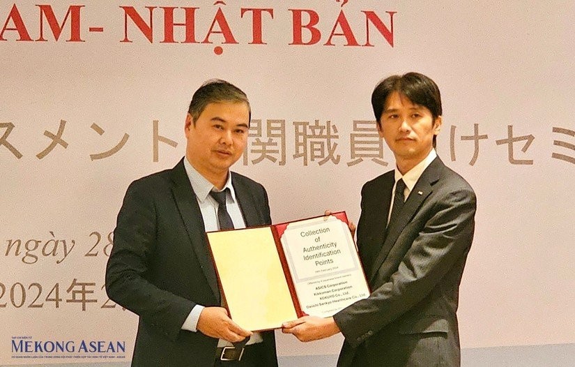 | Giám đốc Công ty ASICS trao tặng cẩm nang hướng dẫn phân biệt thật - giả cho Tổng Cục Quản lý thị trường trong khuôn khổ Hội thảo “Bảo vệ quyền sở hữu trí tuệ Việt Nam - Nhật Bản” |