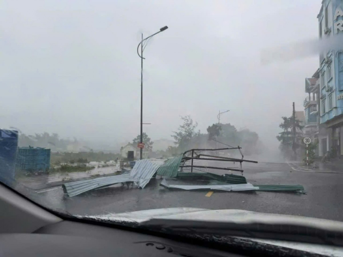 | Nhiều mái tôn tại Vân Đồn bị gió tốc bay ra đường (Ảnh: Bạn đọc cung cấp). |