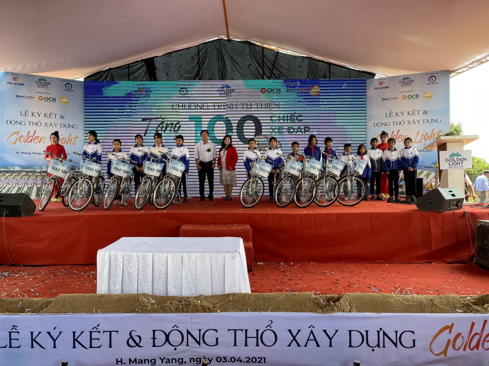 Dịp này, chủ đầu tư và đơn vị phát triển dự án là Công ty CP Đầu tư và Phát triển Khải Tín DN trao tặng 100 xe đạp, trị giá gần 120 triệu đồng cho học sinh H.Mang Yang, nhằm động viên các em tiếp tục nỗ lực vượt khó đến trường.