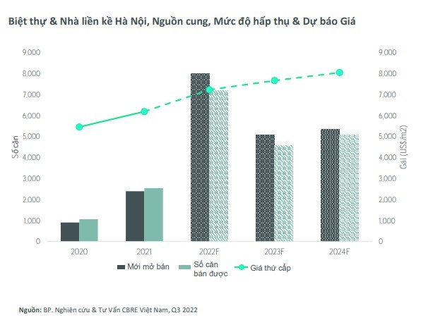 Theo báo cáo mới nhất của CBRE, thời gian gần đây, giá sơ cấp biệt thự và nhà liền kề Hà Nội đã tăng đáng kể. Riêng trong quý III/2022, mức giá bình quân toàn thị trường biệt thự, nhà liền kề Hà Nội đã tăng 36% so với cùng kỳ trong đó, giá sản phẩm biệt thự tăng 42%, giá nhà phố thương mại tăng 50%.