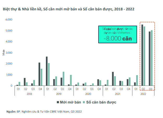 Về tính thanh khoản, lực hấp thụ của sản phẩm biệt thự và nhà liền kề Hà Nội trong quý 2 và 3 vừa qua tiếp tục được thúc đẩy mạnh mẽ nhờ sức hút của dự án Vinhomes Ocean Park 2 – The Empire. CBRE cũng đưa ra nhận định tích cực cho phân khúc biệt thự và nhà liền kề Hà Nội với việc dự báo giá thứ cấp sẽ tiếp tục tăng và số lượng mở bán sẽ giảm đi sau năm 2022.