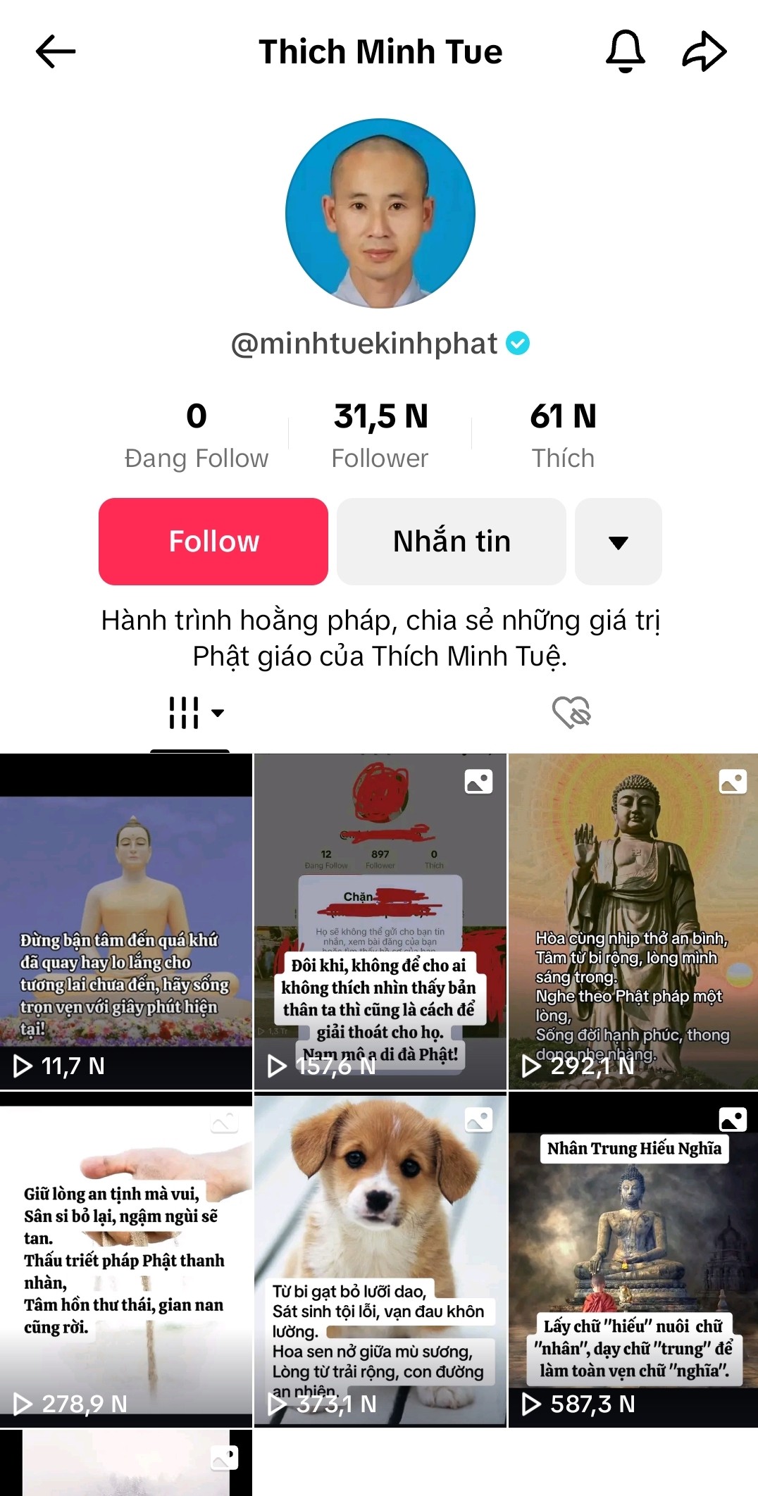 | Kênh TikTok có tick xanh mang tên "Thich Minh Tue". (Ảnh chụp màn hình) |