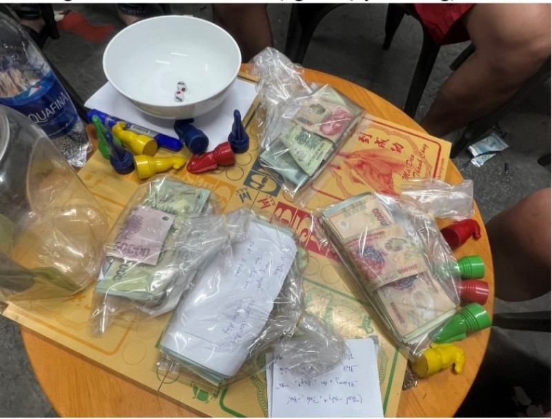 Tang vật thu giữ tại hiện trường gần 200 triệu đồng, 4 bộ bài tây; 1 bộ cờ cá ngựa; 1 lọ bằng nhựa, bên trong có 400.000 đồng tiền xâu; 5 xe ô tô, 7 xe máy.