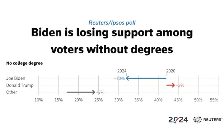 Trong cuộc thăm dò của Reuters/Ipsos, Tổng thống Joe Biden đang mất dần sự ủng hộ của các cử tri không có bằng đại học. Nhóm này bao gồm người da đen, phụ nữ gốc Tây Ban Nha, cử tri trẻ và phụ nữ ngoại ô. Cuộc cạnh tranh giữa Tổng thống Joe Biden và các ứng viên khác trở nên căng thẳng hơn nhiều so với cuộc bầu cử năm 2020 giữa ông Joe Biden và ông Donald Trump.