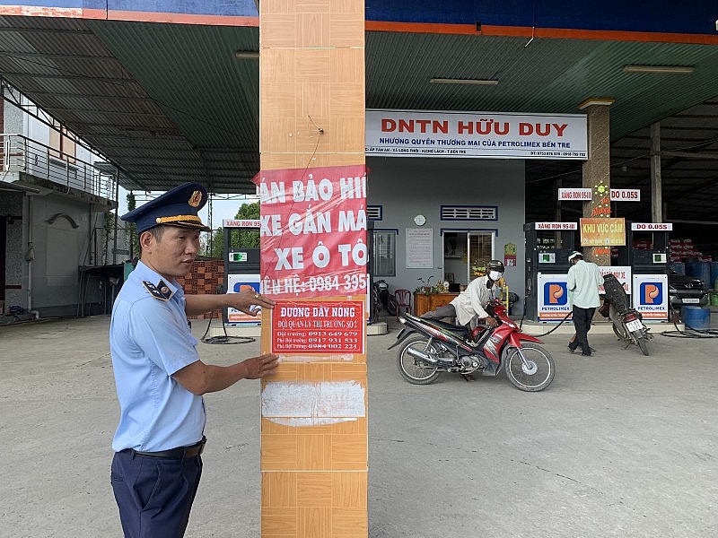 Đội Quản lý thị trường số 2 đang dán số điện thoại đường dây nóng tại một cửa hàng kinh doanh xăng dầu ở xã Hưng Khánh Trung B, huyện Chợ Lách, tỉnh Bến Tre. |