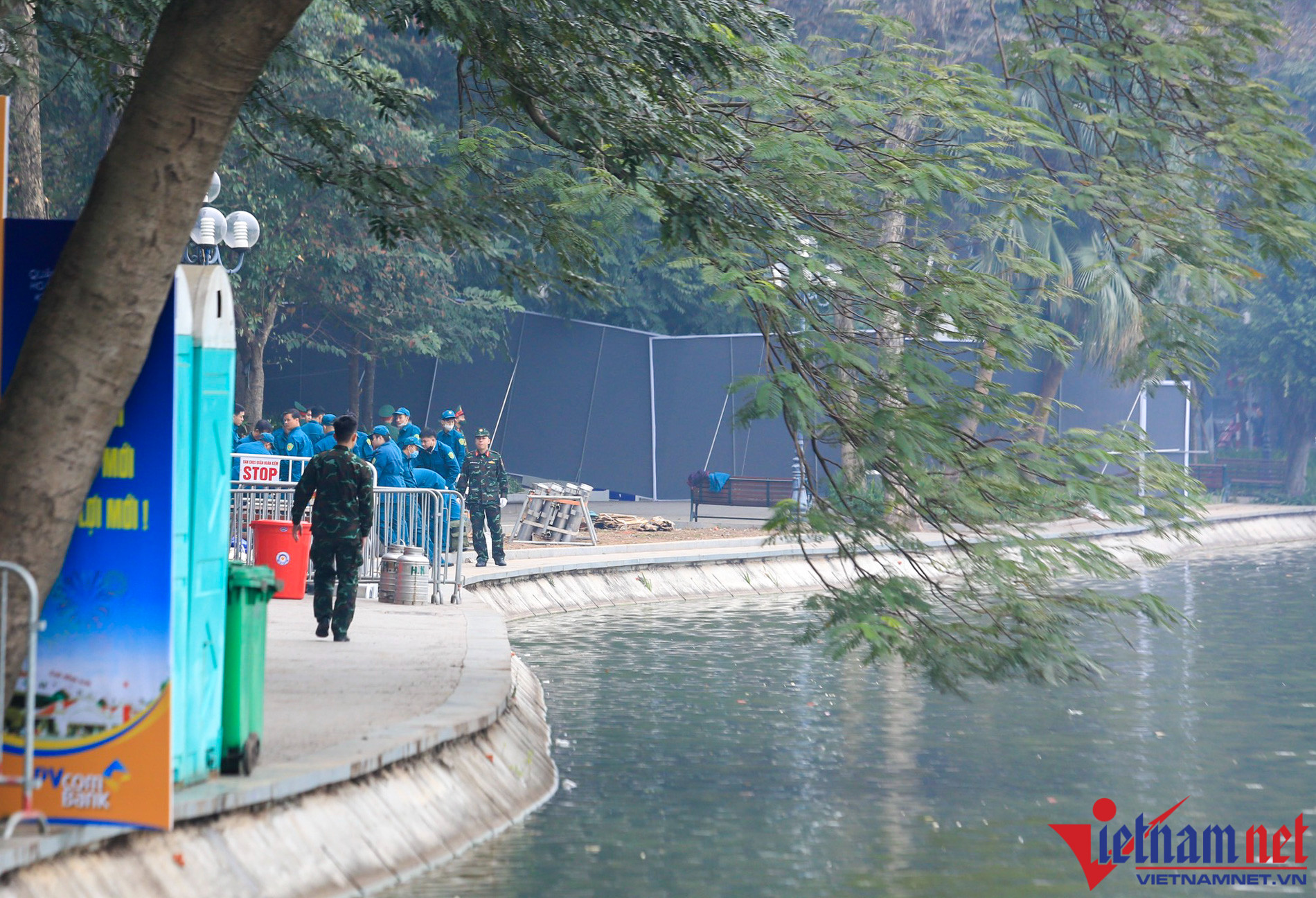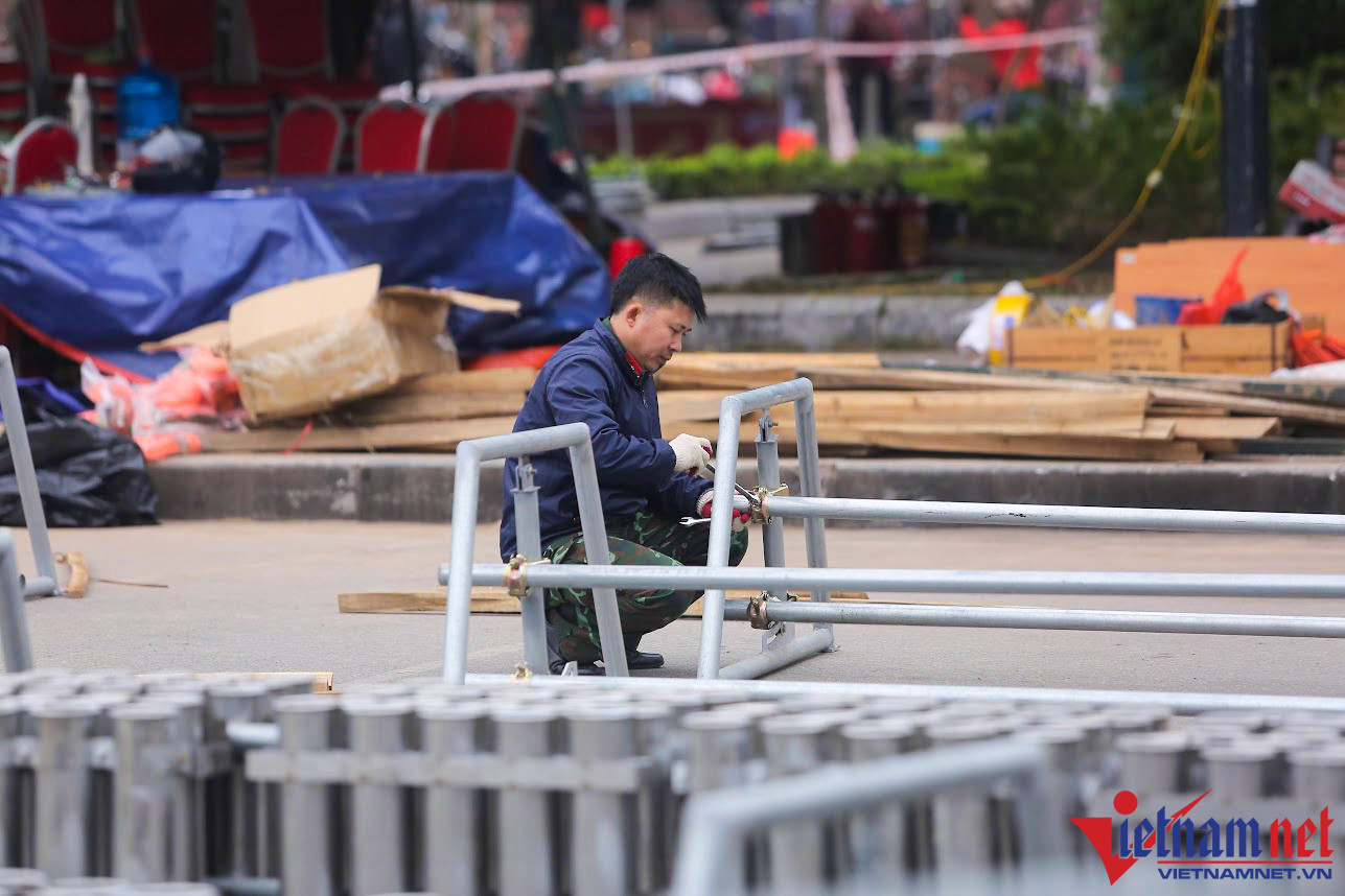 Rất đông lực lượng quân đội đang hoàn thành các trận địa pháo hoa. Các khu vực bắn pháo hoa đều có hàng rào. |
