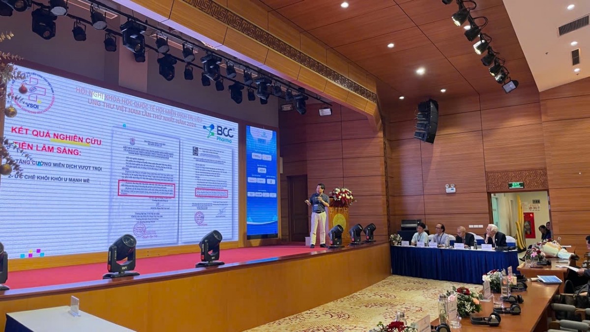 | Giáo sư. Tiến sĩ. Viện sĩ Nguyễn Văn Năm trình bày kết quả nghiên cứu tại Hội thảo quốc tế về miễn dịch trị liệu ung thư |