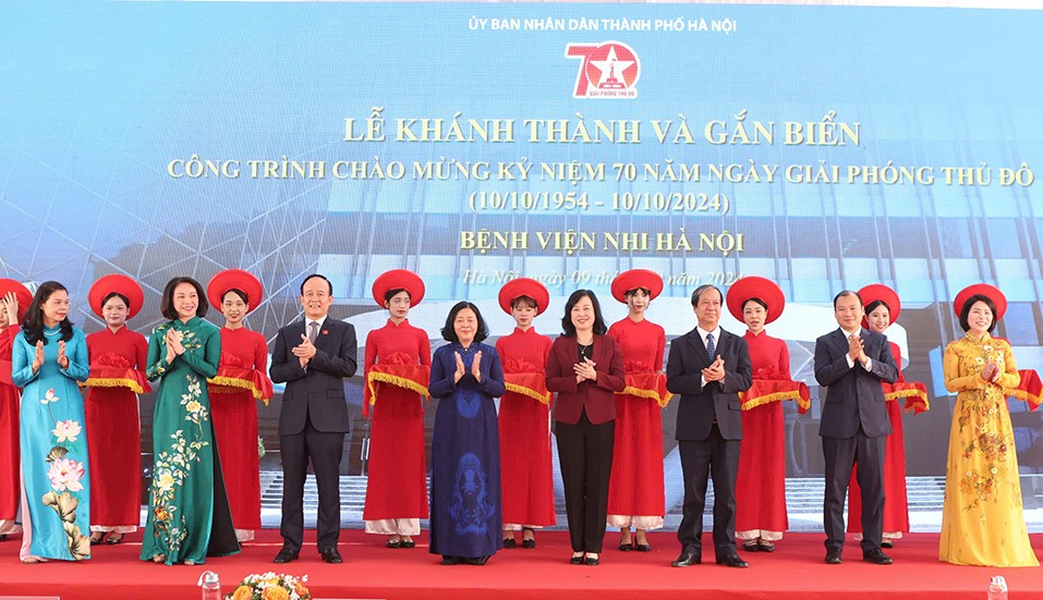 | Bí thư Thành ủy Hà Nội Bùi Thị Minh Hoài, Bộ trưởng Bộ Y tế Đào Hồng Lan và lãnh đạo Bộ, ngành, thành phố cắt băng khánh thành Bệnh viện Nhi Hà Nội - Ảnh: Trần Minh |