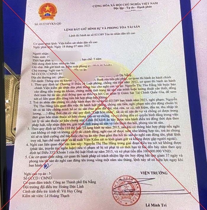 Sau đó đối tượng sử dụng thông tin chị H. cung cấp làm giả “Lệnh bắt giữ hình sự và phong tỏa tài sản” của Viện Kiểm sát Nhân dân tối cao để de dọa chị H. không được liên lạc với người khác.
