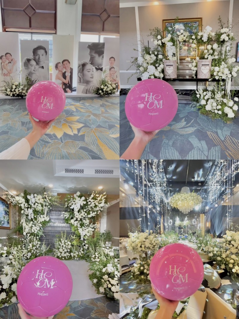 Đặc biệt, cặp đôi còn chuẩn bị 1 quả bóng màu hồng được in lồng 2 chữ cái H và M - tên viết tắt của cô dâu và chú rể. Dù mục đích sử dụng của quả bóng này chưa được tiết lộ, nhưng người hâm mộ cũng rất thích thú và đoán rằng, quả bóng sẽ giữ vai trò đặc biệt trong tiệc cưới của cầu thủ Đoàn Văn Hậu và Doãn Hải My.