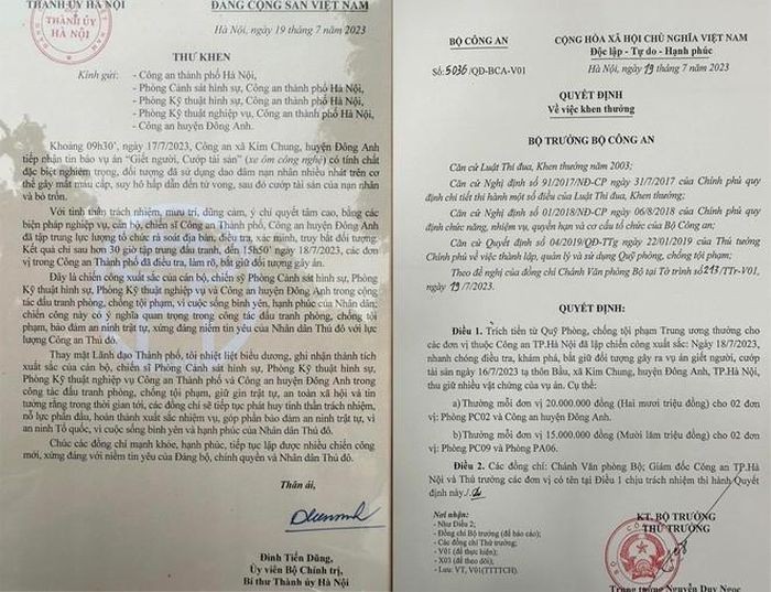 | Quyết định khen thưởng của Trung tướng Nguyễn Duy Ngọc, Thứ trưởng Bộ Công an và Thư khen của Bí thư Thành ủy Hà Nội Đinh Tiến Dũng |
