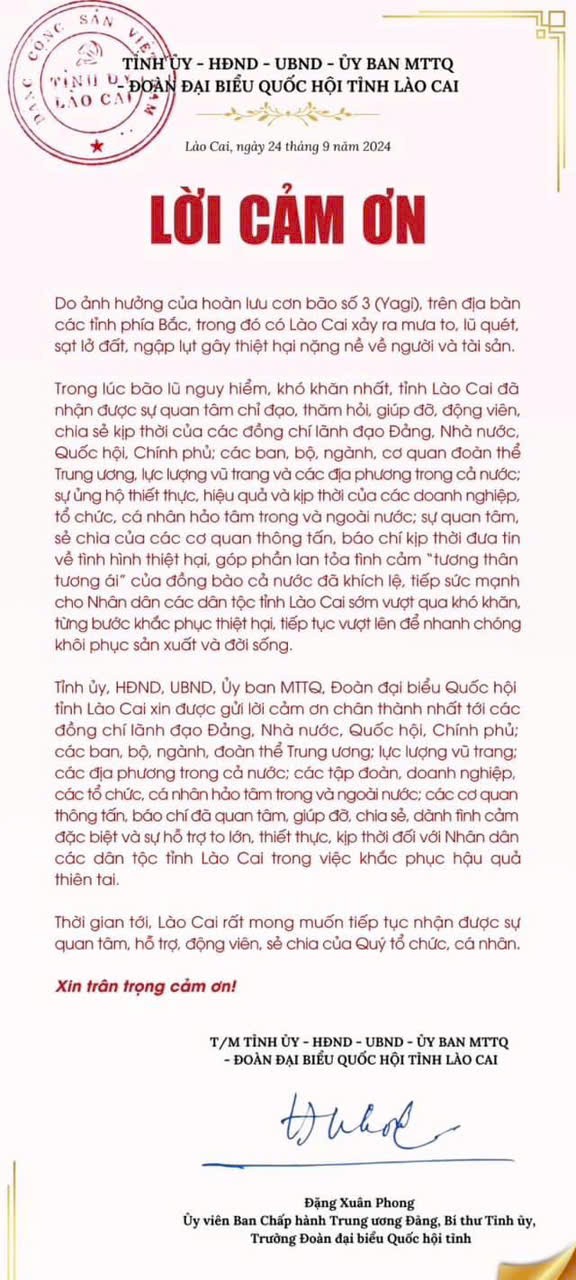 Tỉnh ủy, HĐND, UBND, Ủy ban MTTQ, Đoàn đại biểu Quốc hội tỉnh Lào Cai xin được gửi lời cảm ơn chân thành nhất tới các đồng chí lãnh đạo Đảng, Nhà nước, Quốc hội, Chính phủ; các ban, bộ, ngành, đoàn thể Trung ương; lực lượng vũ trang; các địa phương trong cả nước; các tập đoàn, doanh nghiệp, các tổ chức, cá nhân hảo tâm trong và ngoài nước; các cơ quan thông tấn, báo chí đã quan tâm, giúp đỡ, chia sẻ, dành tình cảm đặc biệt và sự hỗ trợ to lớn, thiết thực, kịp thời đối với Nhân dân các dân tộc tỉnh Lào Cai trong việc khắc phục hậu quả thiên tai.