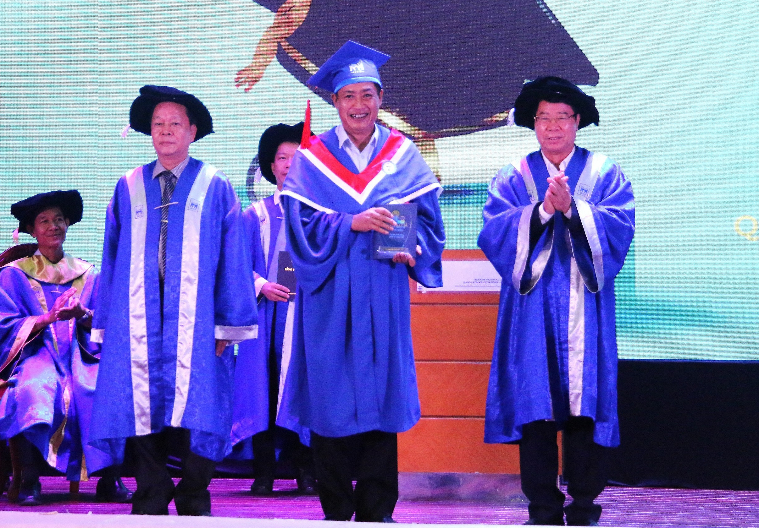 | Ông Nguyễn Hữu Đông, Bí thư Tỉnh ủy Sơn La, được vinh danh là tân thạc sĩ tiêu biểu ngành Quản trị An ninh phi truyền thống, Trường Quản trị và Kinh doanh - ĐH Quốc gia Hà Nội. Ảnh: Thanh Hùng. |
