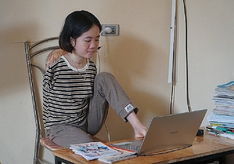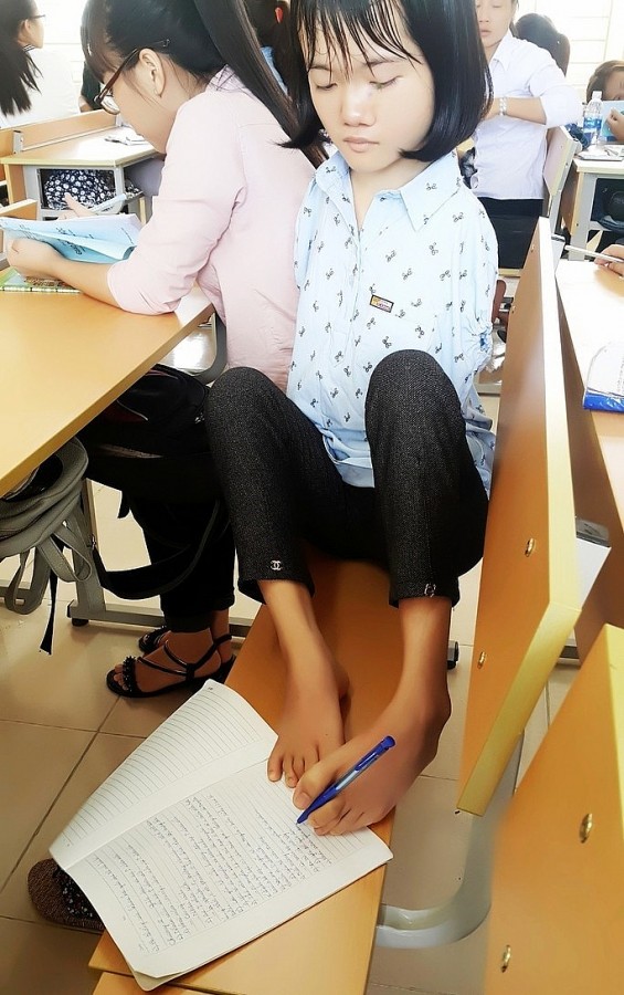 Mặc dù không may mắn, sinh ra không có 2 tay, phải viết bằng chân nhưng Lê Thị Thắm luôn nỗ lực vươn lên trong học tập và trong cuộc sống. Ảnh: NVCC