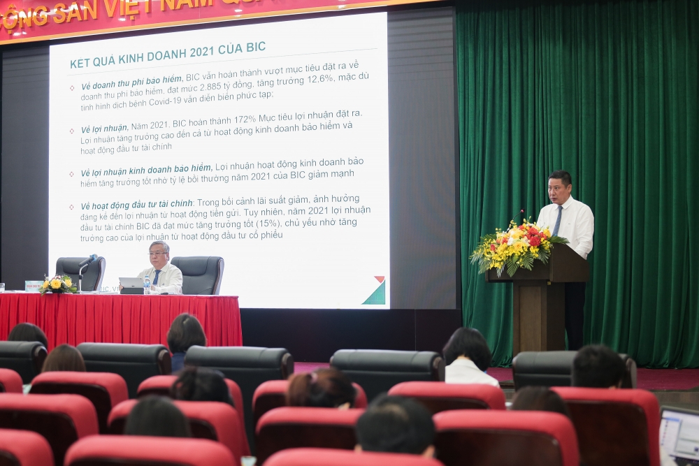 BIC cũng không nằm ngoài những ảnh hưởng tiêu cực từ dịch bệnh. Tuy nhiên, với nền tảng khách hàng đã gắn bó với BIC và đặc biệt là nền tảng khách hàng rộng lớn từ Ngân hàng mẹ BIDV cùng những giải pháp kinh doanh kiên trì, chủ động, sáng tạo, BIC đã có một năm kinh doanh thành công, hoàn thành xuất sắc các chỉ tiêu kế hoạch do Đại hội đồng cổ đông giao. Cụ thể, tổng doanh thu phí bảo hiểm riêng Công ty mẹ năm 2021 đạt 2.885 tỷ đồng, tăng trưởng 12,6% so với năm 2020, hoàn thành 102% kế hoạch năm. Trong đó, doanh thu phí bảo hiểm gốc đạt 2.716 tỷ đồng, tăng trưởng 13,4% so với năm trước, cao gấp 3 lần mức tăng trưởng chung toàn thị trường, giúp BIC giữ vững vị trí thứ 7 thị trường về thị phần doanh thu phí bảo hiểm gốc. Với định hướng phát triển bền vững, các chỉ tiêu hiệu quả của BIC năm qua đều đạt kết quả tốt. BIC tiếp tục có lãi cao từ hoạt động kinh doanh bảo hiểm. Lợi nhuận hợp nhất trước thuế đạt 502 tỷ đồng, giúp BIC lần đầu tham gia Câu lạc bộ 500 tỷ đồng lợi nhuận trước thuế, đồng thời hoàn thành 172% kế hoạch năm. Tỷ lệ chi trả cổ tức năm 2021 được các cổ đông thống nhất ở mức 15%.