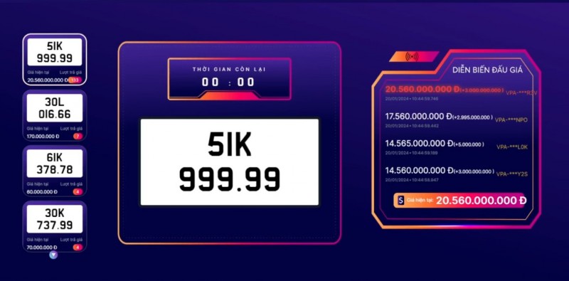 Theo diễn biến phiên đấu giá (khung 10h15 đến 10h45), trong 5 phút đầu, biển số xe này đã được một khách hàng trả mức giá gần 6 tỷ đồng. Kết thúc phiên đấu giá, biển số 51K-999.99 được chốt giá 20,56 tỷ đồng.